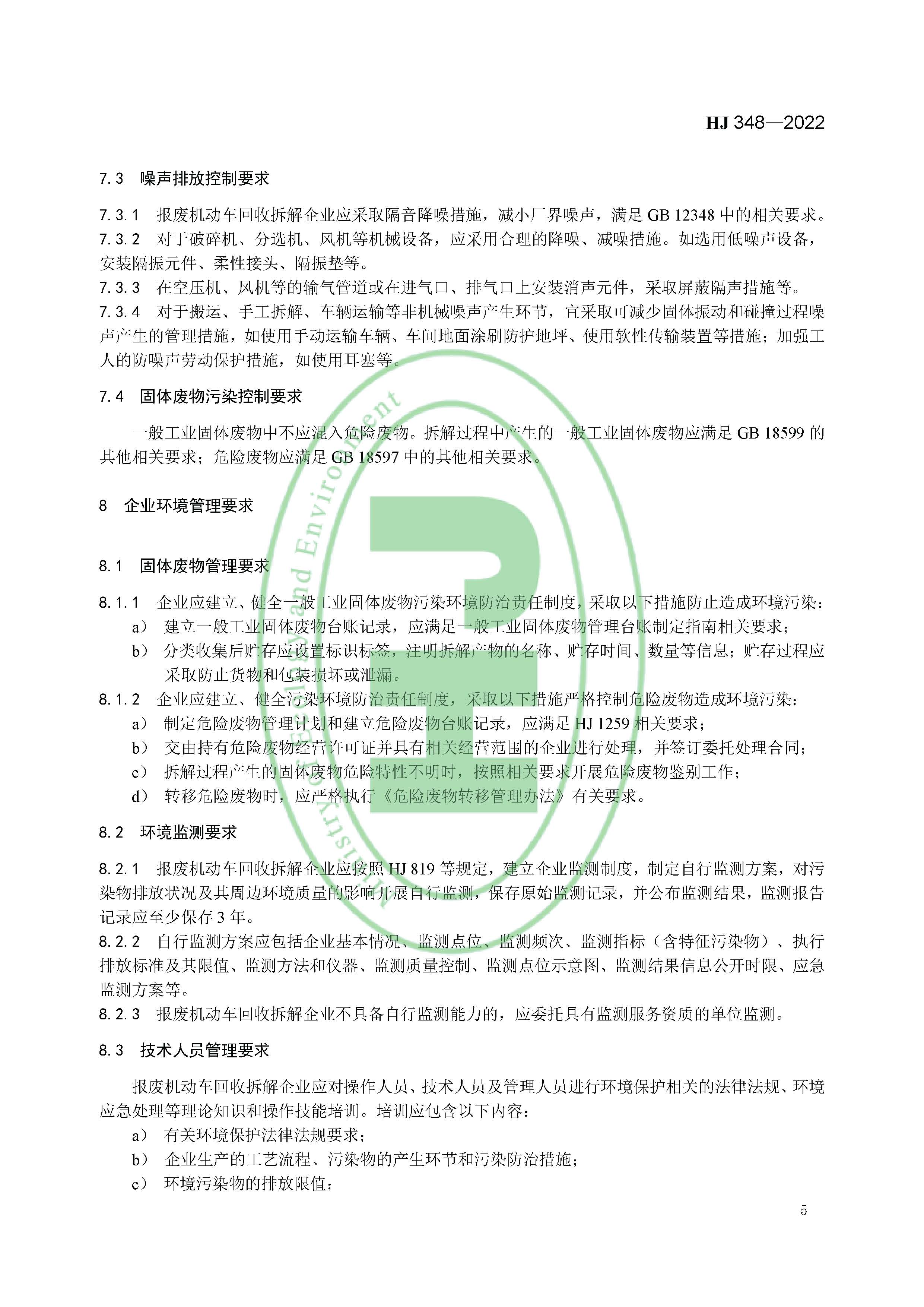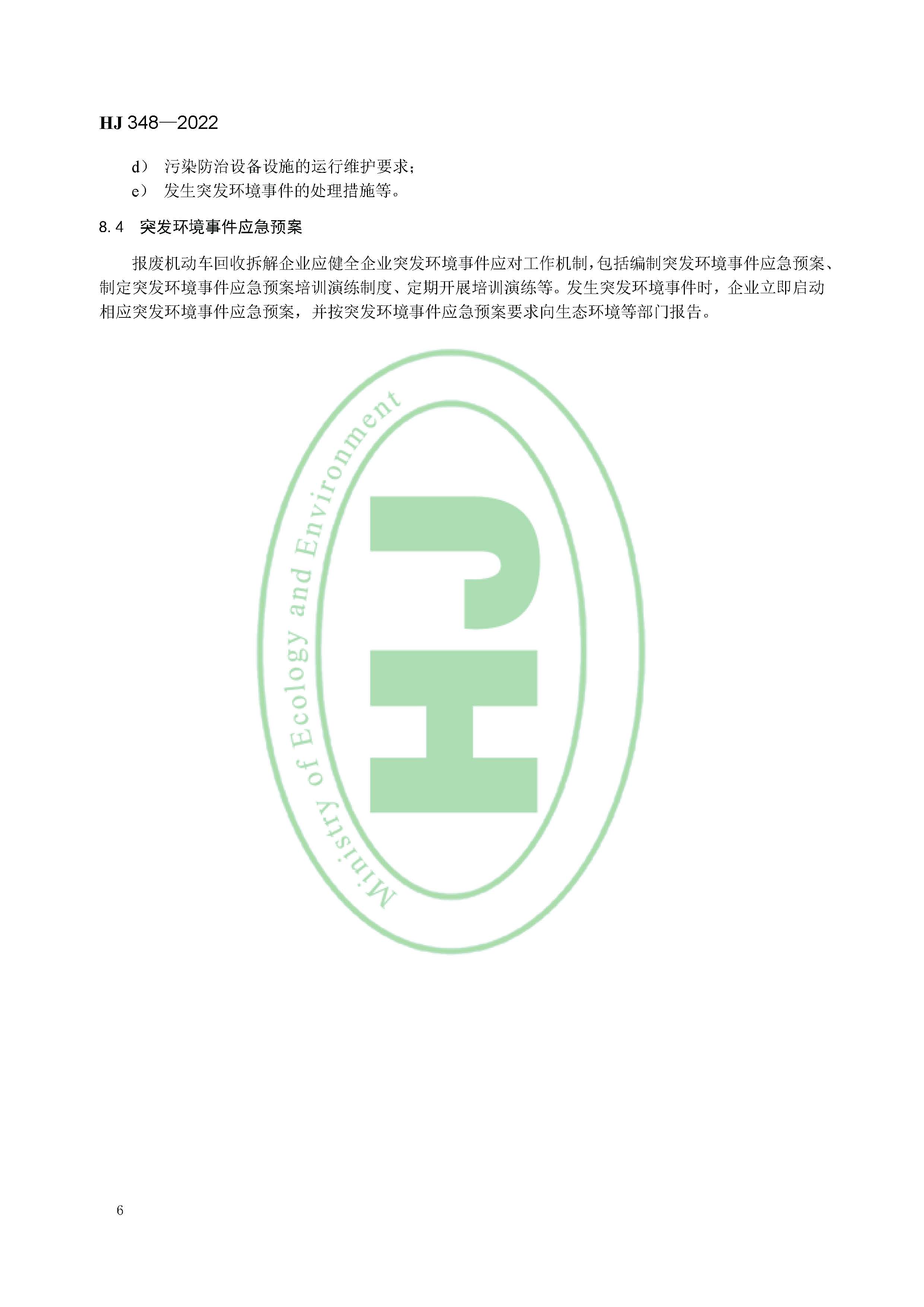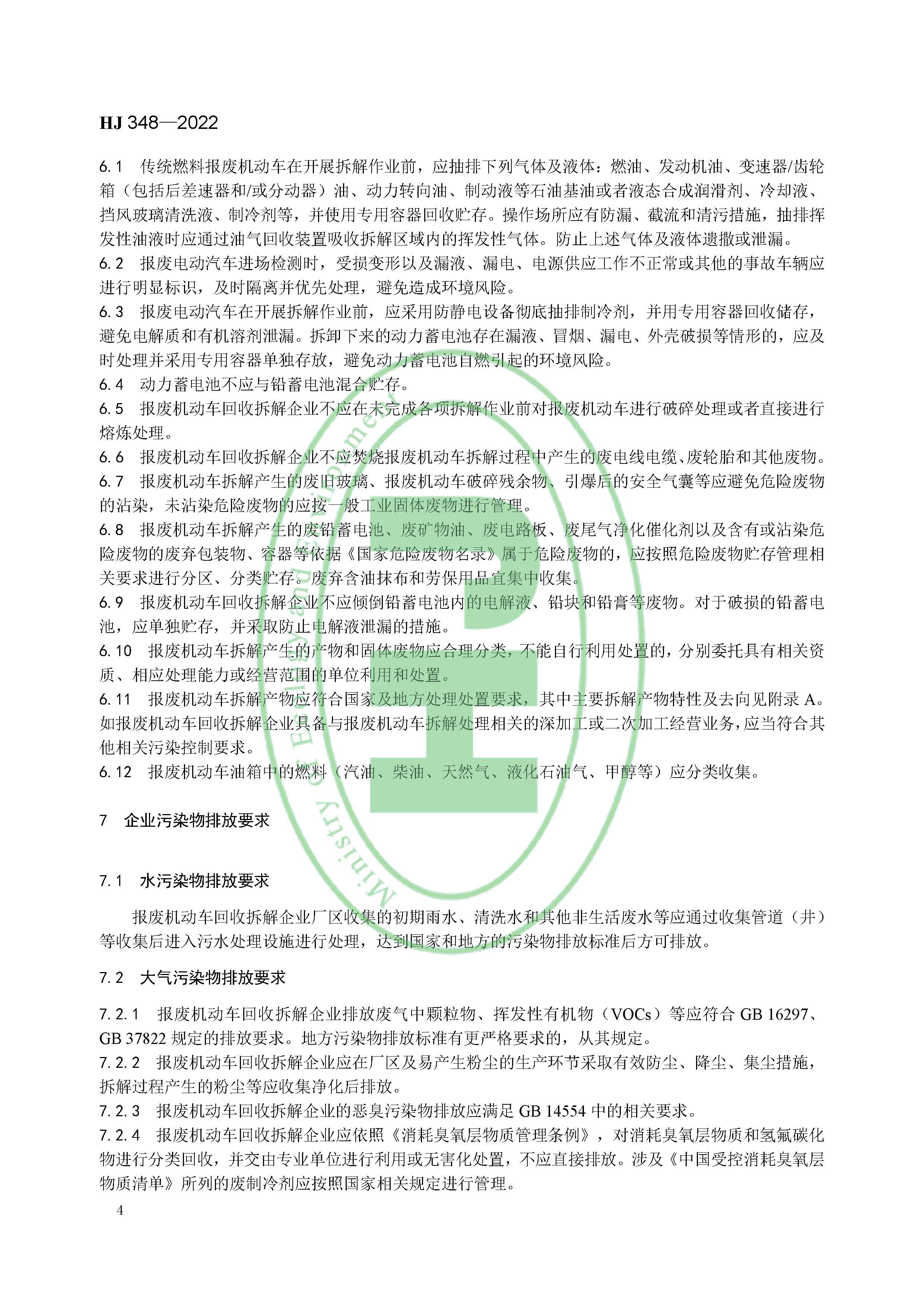 為貫徹《中華人民共和國(guó)環(huán)境保護(hù)法》《中華人民共和國(guó)固體廢物污染環(huán)境防治法》《報(bào)廢機(jī)動(dòng)車回收管理辦法》等法律法規(guī),防治報(bào)廢機(jī)動(dòng)車拆解過(guò)程的環(huán)境污染,規(guī)范報(bào)廢機(jī)動(dòng)車拆解環(huán)境管理工作,制定本標(biāo)準(zhǔn)。本標(biāo)準(zhǔn)規(guī)定了報(bào)廢機(jī)動(dòng)車拆解總體要求,企業(yè)基礎(chǔ)設(shè)施和拆解過(guò)程污染控制要求,污染物排放要求,環(huán)境管理要求以及環(huán)境監(jiān)測(cè)與突發(fā)環(huán)境事件應(yīng)急預(yù)案要求。本標(biāo)準(zhǔn)首次發(fā)布于 2007 年,本次是對(duì)《報(bào)廢機(jī)動(dòng)車拆解環(huán)境保護(hù)技術(shù)規(guī)范》(HJ 348—2007)的第一次修訂。