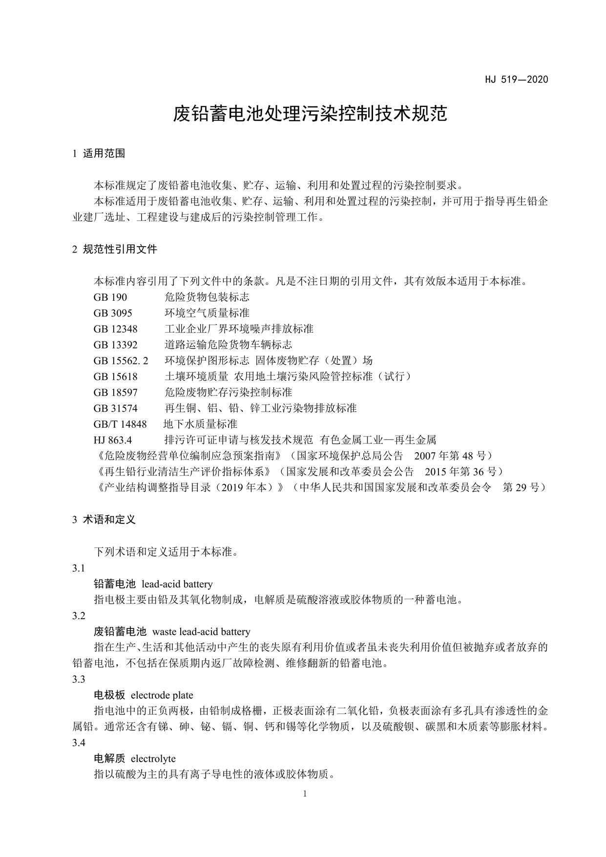 為貫徹《中華人民共和國環(huán)境保護(hù)法》和《中華人民共和國固體廢物污染環(huán)境防治法》等法律法規(guī), 防治污染,保護(hù)生態(tài)環(huán)境,規(guī)范廢鉛蓄電池收集、貯存、運(yùn)輸、利用和處置過程的污染控制,制定本標(biāo)準(zhǔn)。本標(biāo)準(zhǔn)規(guī)定了廢鉛蓄電池收集、貯存、運(yùn)輸、利用和處置過程的污染控制要求。 本標(biāo)準(zhǔn)附錄A~附錄C為資料性附錄。 本標(biāo)準(zhǔn)首次發(fā)布于2009年,本次為第一次修訂。